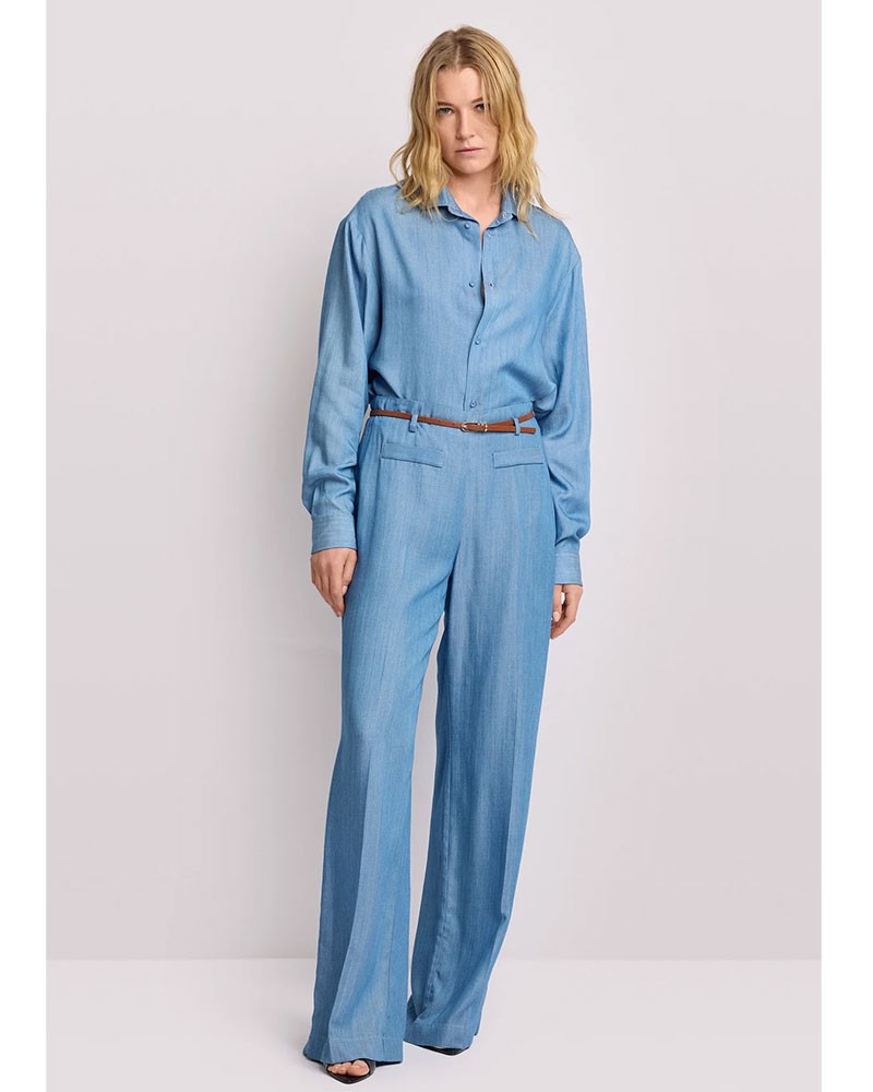 Die KOCCA Metel Palazzo-Hose besticht durch eine elegante und moderne Silhouette mit extra weiten, fließenden Beinen und weichen Volumina, die jede Bewegung mitmachen. Der strukturierte, hohe Bund wird durch einen schmalen Gürtel dezent betont. Raffinierte Details wie die angedeuteten Vordertaschen und die Bügelfalte verleihen der Hose eine edle Note.
