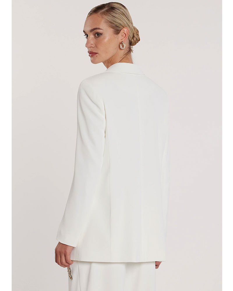 Eine elegante und auffällige Jacke mit langen Ärmeln und einer doppelten Knopfleiste, die die Silhouette stilvoll betont. Strassapplikationen verleihen ihr Glanz und Glamour und machen sie zu einem echten Statement-Piece – perfekt für besondere Anlässe oder elegante Outfits.