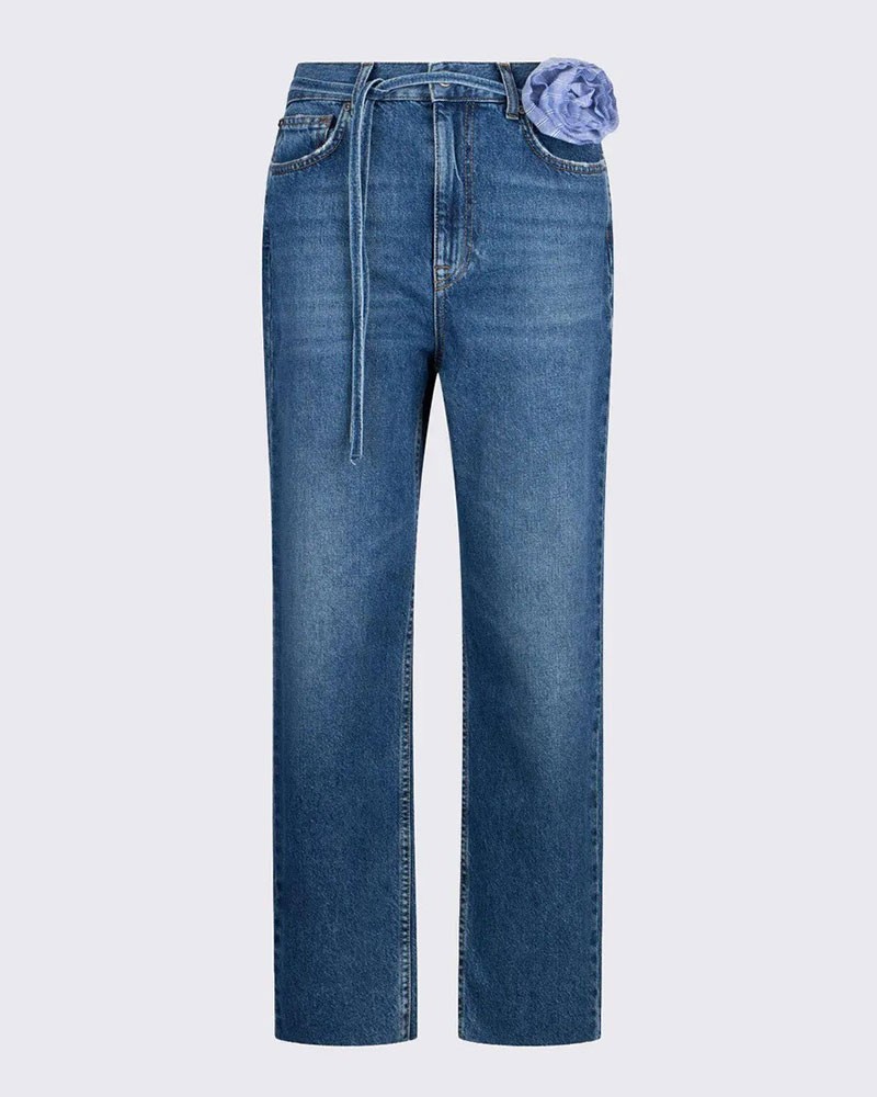 Diese eleganten Straight-Leg-Jeans von Liu Jo aus reiner Baumwolle bieten eine strukturierte und dennoch bequeme Passform und interpretieren den klassischen Five-Pocket-Stil mit femininen Details neu. Ein schmaler, farblich passender Denim-Gürtel und eine markante, gestreifte Stoffblume betonen die Taille und verleihen dem lässigen Look eine romantische Note. Abgerundet wird das Design durch offene Kanten und ein dezentes Logo-Detail hinten. Die Hose bietet eine moderne Silhouette, die perfekt für einen raffinierten Alltagsstil geeignet ist.