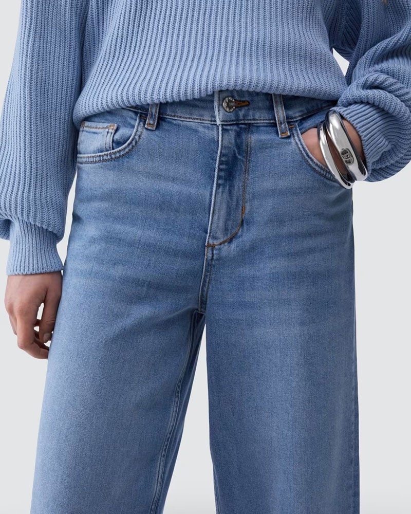 Ausgestellte, verkürzte Jeans mit Frontverschluss mit sichtbarem Logoknopf und verdecktem Reißverschluss, Bund mit Gürtelschlaufen, fünf Taschen, Kontrastnähten, Logo-Applikation aus Metall hinten, Used-Look und leichtem Stretchanteil.