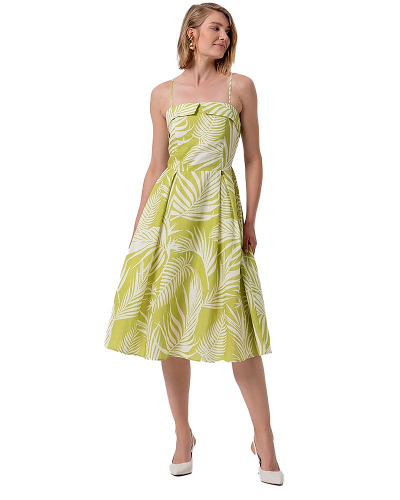 Das ärmellose Midikleid von Fracomina besticht durch ein lebendiges Blattmuster, das dem Look Frische und Persönlichkeit verleiht. Der eckige Ausschnitt betont das Dekolleté modern, während die dünnen Träger für Leichtigkeit und Weiblichkeit sorgen. Der voluminöse Faltenrock verleiht dem Kleid Schwung und fließende Bewegungen und macht es ideal für elegante und legere Sommeroutfits.