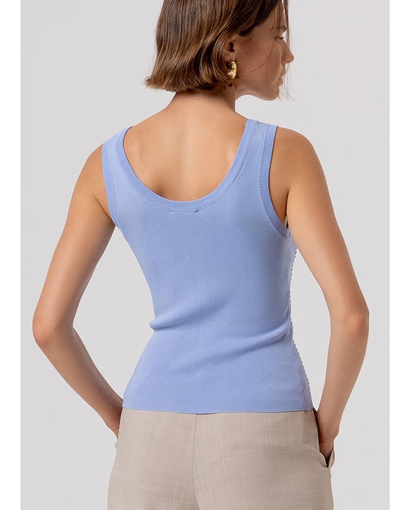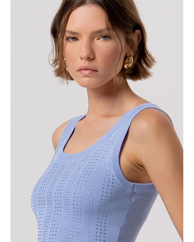 Ärmelloses Stricktop in schmaler Passform mit schmeichelhaftem, figurbetontem Design. Der Rundhalsausschnitt verleiht ihm eine klassische und vielseitige Note, während die funkelnden Strasssteine einen glamourösen, femininen Akzent setzen – perfekt, um jedem Look, von lässig bis elegant, das gewisse Etwas zu verleihen.