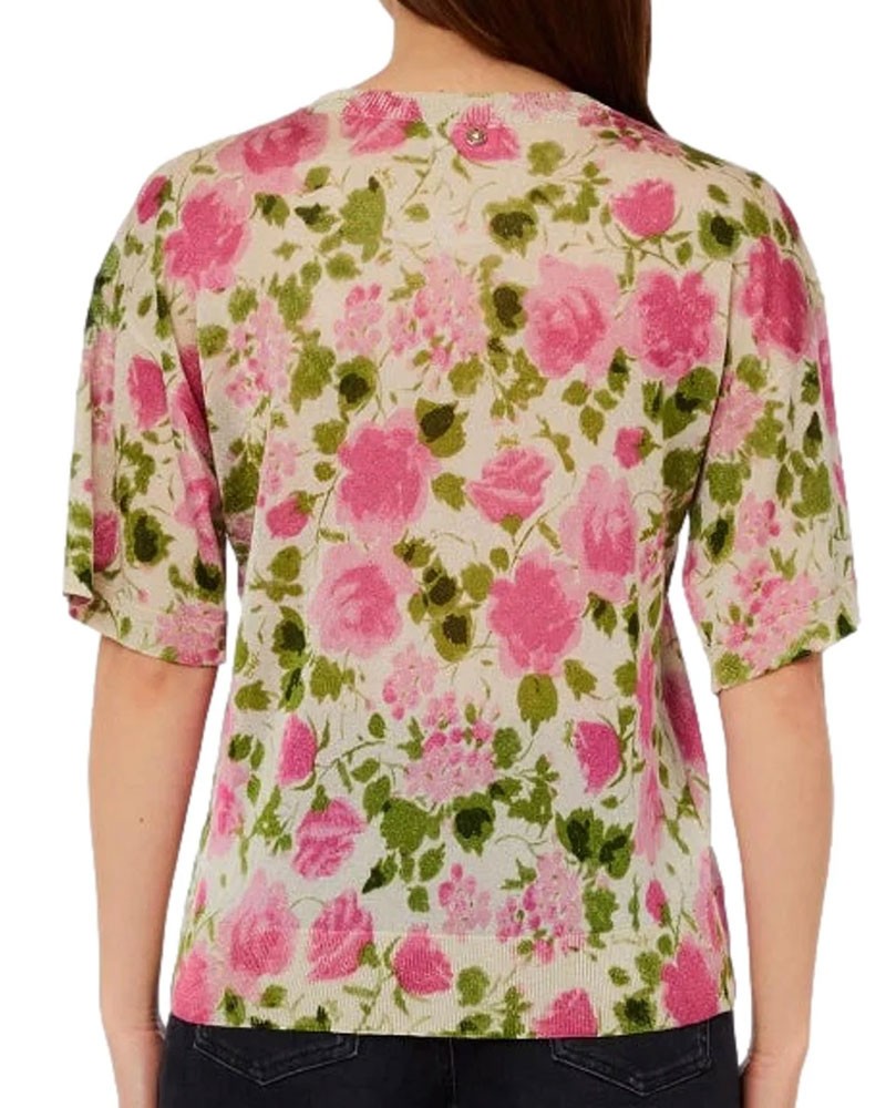 Die neue Liu Jo Kollektion präsentiert einen weichen, kurzärmeligen Pullover aus Garn mit Rundhalsausschnitt und farbenfrohem Blumenmuster – perfekt für den Frühling.