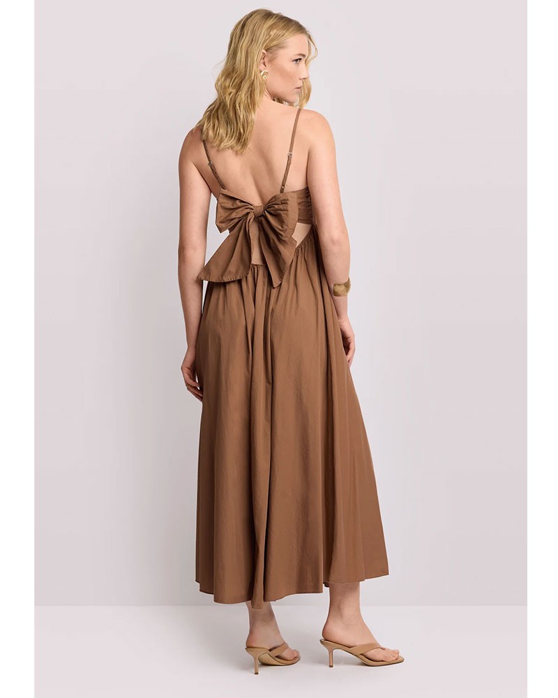 The KOCCA Jasmyn long dress, crafted from cotton, features a feminine and elegant design. The thin, adjustable shoulder straps accentuate the décolleté and ensure a personalized fit. The full, pleated skirt, combined with the defined waist, creates a harmonious and slender silhouette. An oversized self-tie bow stands out on the back, a distinctive detail that adds a romantic and dramatic touch. Perfect for summer dinners and refined garden parties.