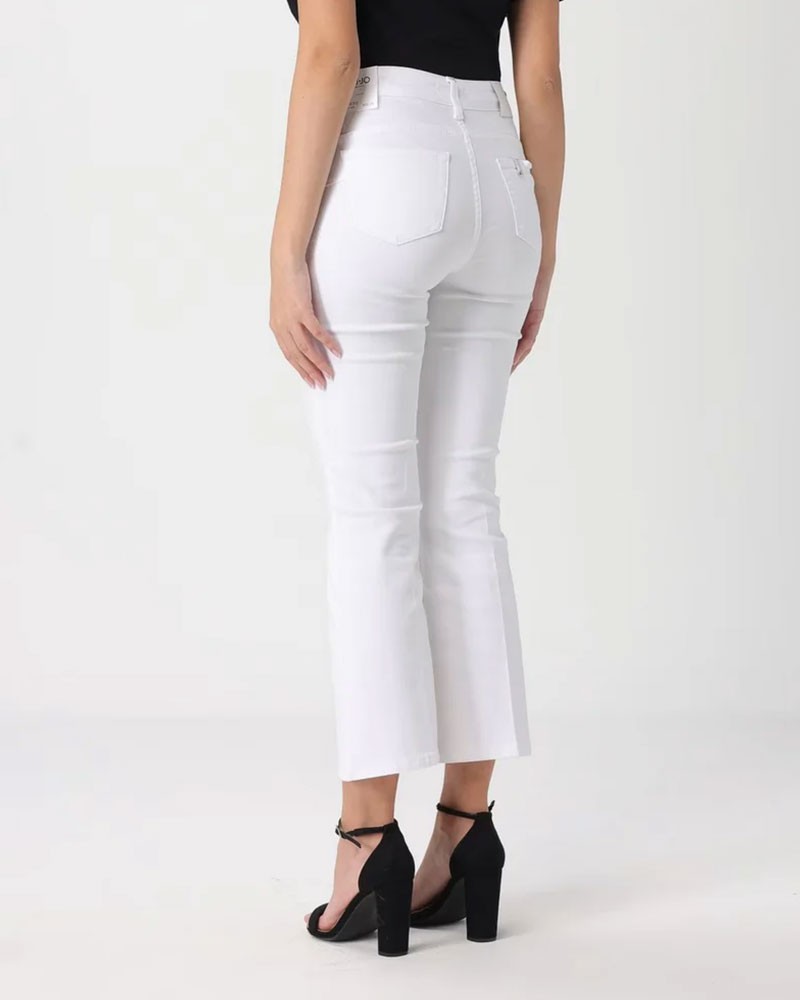 Jeans are made of stretch denim with a stonewash finish and scratching. They feature five pockets, a high waist with a jeweled button closure, and a cropped, slightly flared hem and a slim fit.