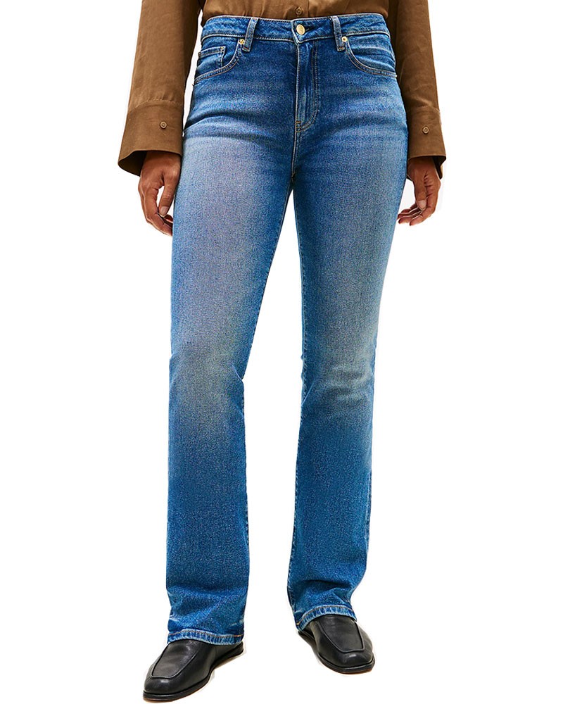 These flared jeans, crafted from stretch cotton denim with whiskering, flatter the figure while offering unparalleled comfort. Whiskering and fading on the front and back, zip and button closure.