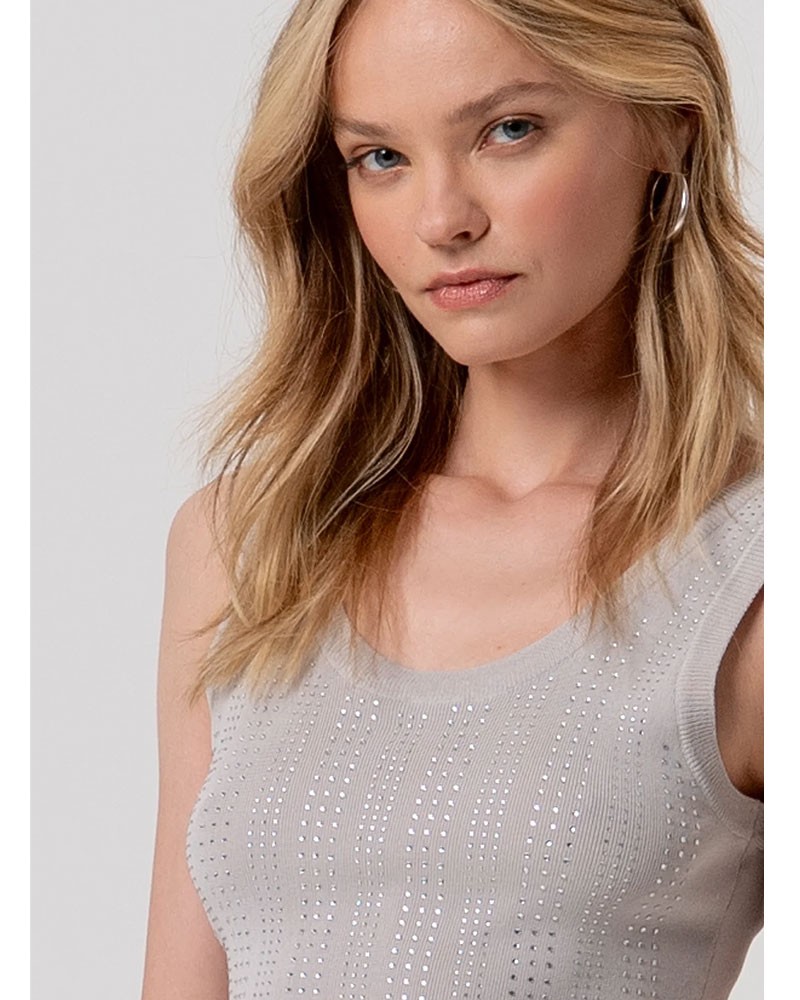 Slim-fit sleeveless knit top with a simple, fitted design that flatters the figure. The crew neck adds a classic and versatile touch, while the sparkling rhinestones add a dazzling, feminine detail, perfect for brightening up any look, from casual to elegant.