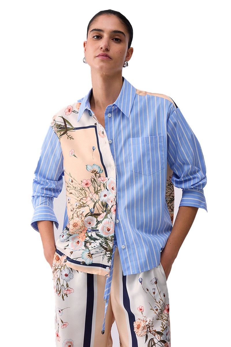 A refined blend of textures and details: this cotton poplin shirt combines the freshness of lightweight fabric with printed twill inserts, adding depth and character to the design. The classic collar and chest pocket exude timeless elegance, while the front button closure completes the piece with practicality and style.
