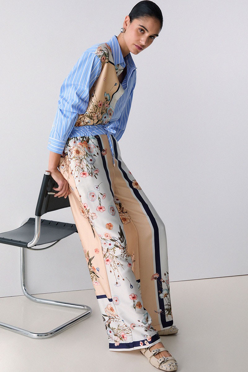 Contemporary style and comfort meet in these printed twill long pants by Liu Jo. The flowing line, with a wide, comfortable leg, offers movement and lightness, while the drawstring waistband ensures an adjustable and casual fit.