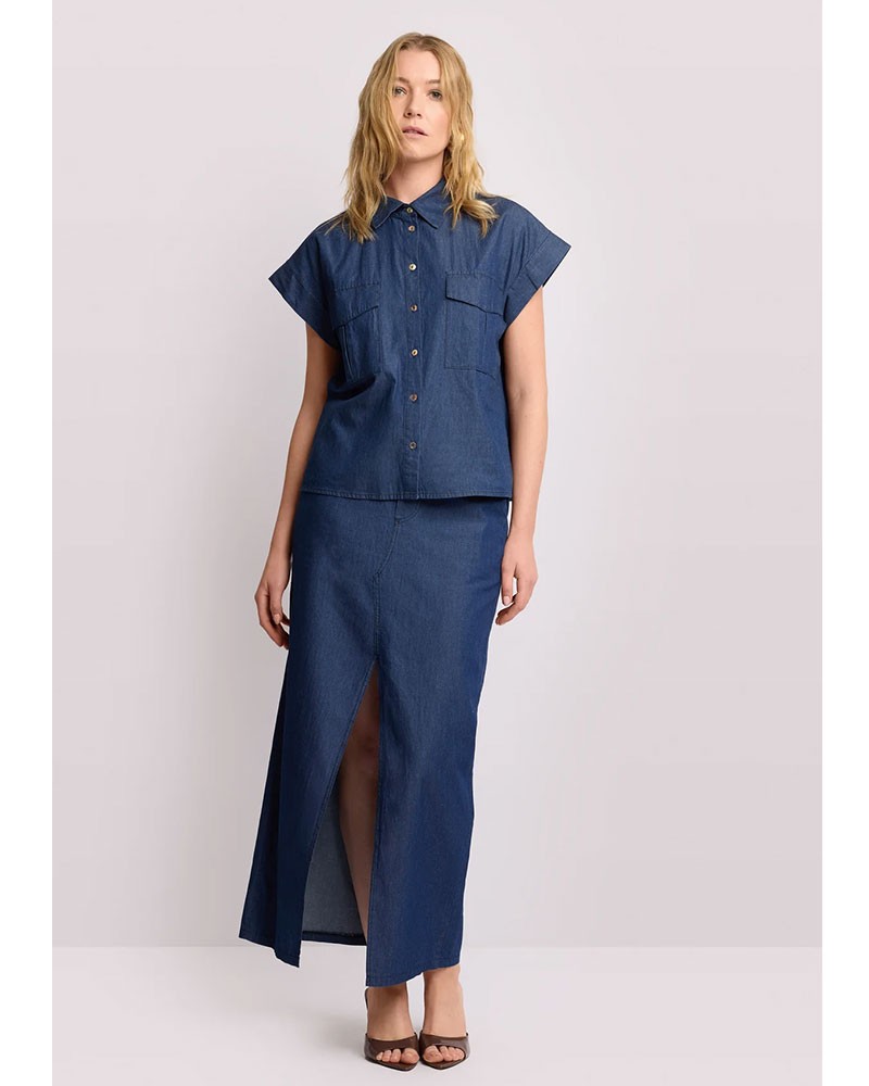 Camisa KOCCA Heinz, confeccionada en algodón y perteneciente a la colección cápsula Pure Verve. Su diseño de manga corta con cuello clásico se realza con dos bolsillos delanteros con solapa, que le aportan un toque funcional y moderno. El cierre frontal con botones metálicos en contraste le da carácter y definición a la prenda. Versátil y contemporánea, es ideal para looks elegantes de diario, looks casuales de oficina o combinada con una falda vaquera para un look moderno y completo.