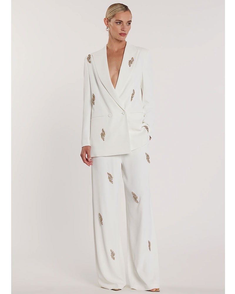 Una chaqueta elegante y llamativa, con mangas largas y una tapeta de doble botón que define la silueta con estilo. Los apliques de pedrería le añaden brillo y glamour, convirtiéndola en una prenda imprescindible, perfecta para ocasiones especiales o conjuntos sofisticados.