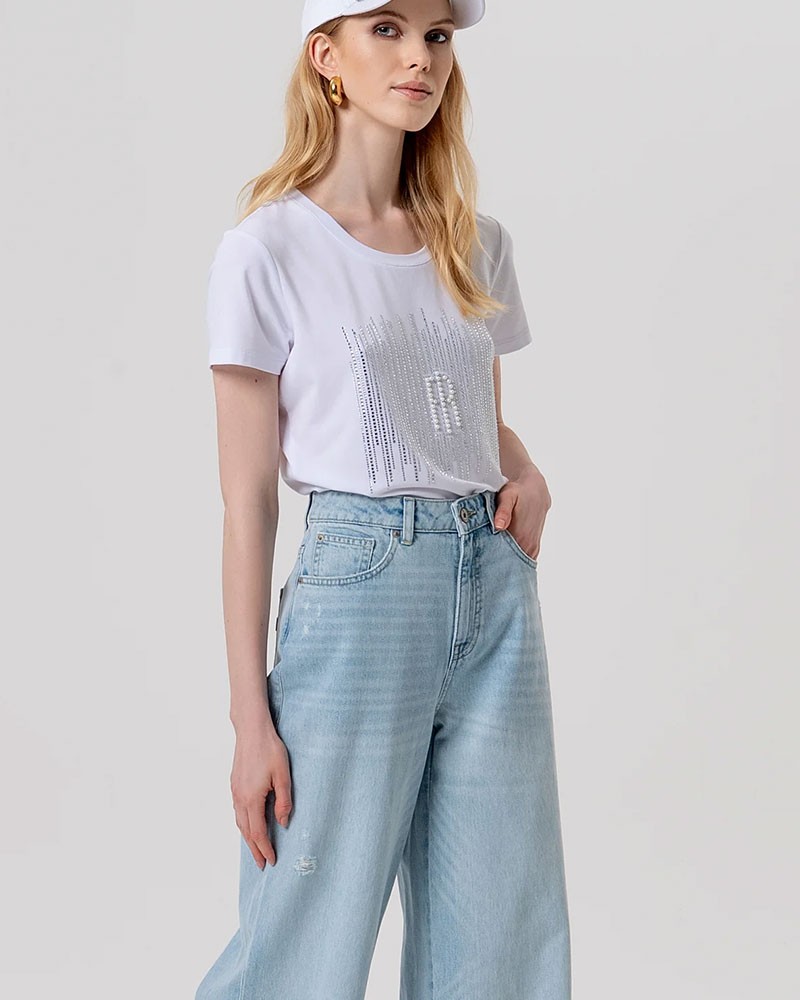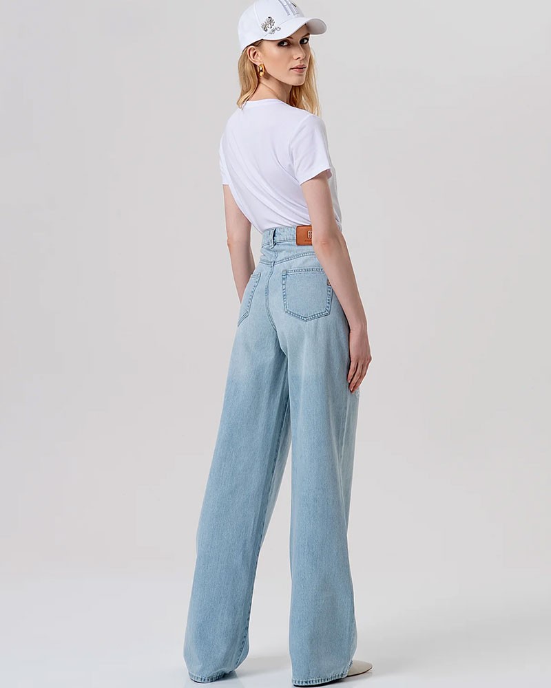 Vaqueros acampanados de Fracomina, con un lavado desteñido que les confiere un aspecto moderno y ligeramente desgastado. Su tiro medio garantiza comodidad y un ajuste perfecto, mientras que el clásico diseño de cinco bolsillos les aporta un toque atemporal. El bajo se ensancha ligeramente, creando un efecto estilizado y un look casual pero sofisticado.