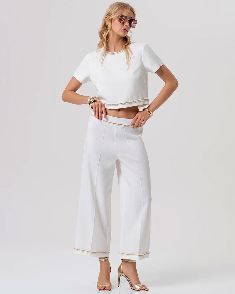 Pantalones culotte cortos de Fracomina, con un corte amplio y contemporáneo que proporciona libertad de movimiento y comodidad. El diseño de talle alto realza la silueta, mientras que los detalles en colores vivos añaden un toque sofisticado y llamativo. El bajo ancho completa la prenda con un estilo moderno y versátil, perfecto para looks elegantes y a la última moda.