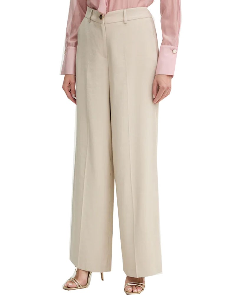 Pantalones palazzo acampanados confeccionados en tejido ligero y transpirable con alto contenido de viscosa. Cintura regular con elástico en la parte trasera, bolsillos laterales, ribete trasero y bajo ancho. Corte regular.