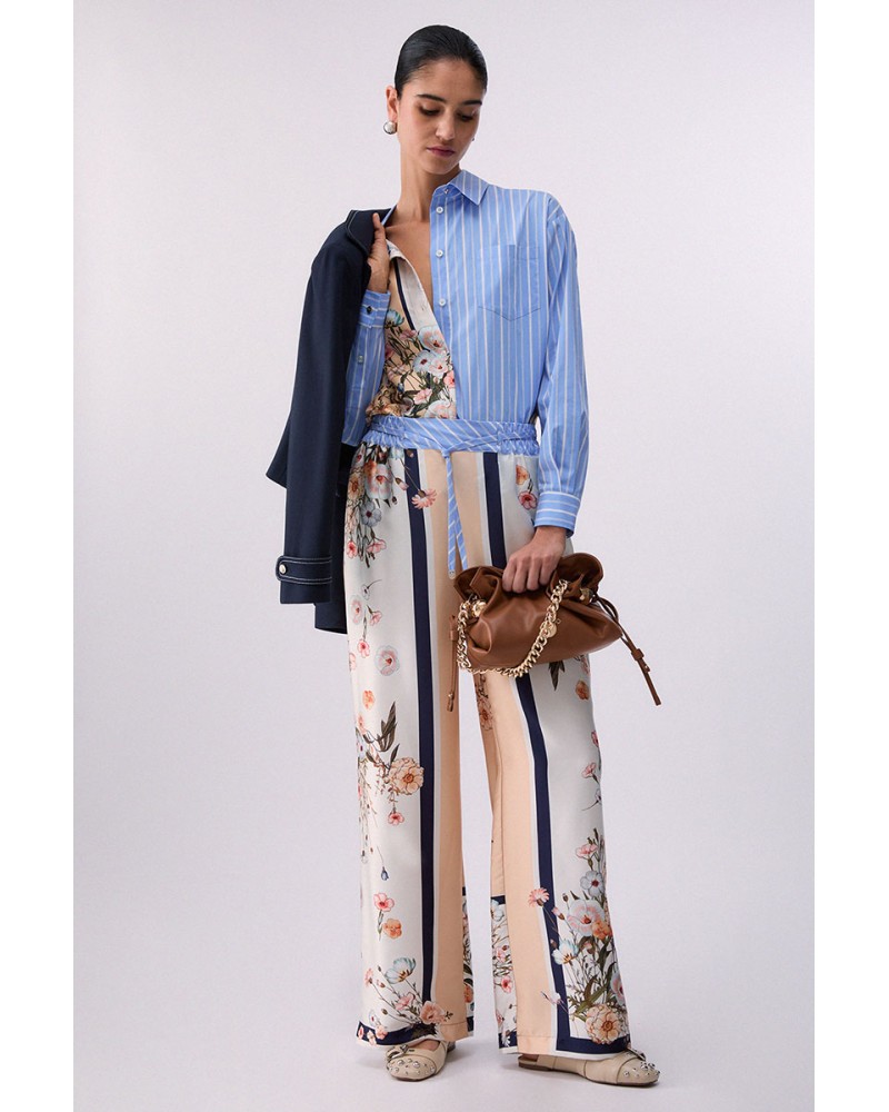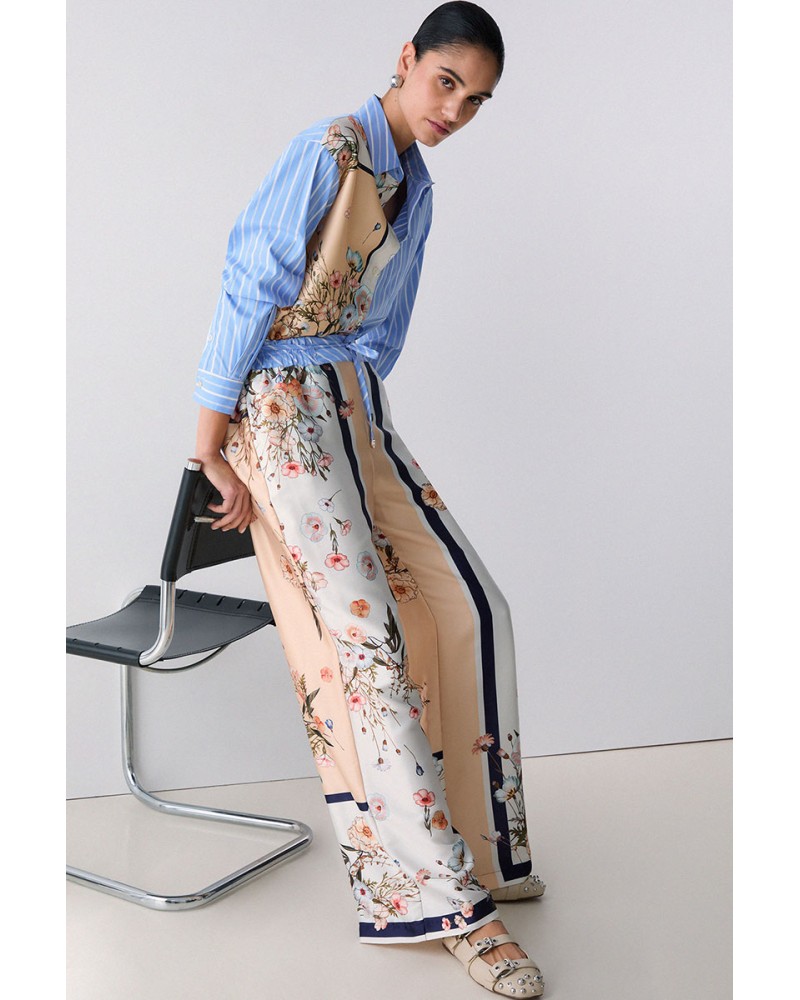 Estilo contemporáneo y comodidad se unen en estos pantalones largos de sarga estampada de Liu Jo. Su corte fluido, con pernera ancha y cómoda, ofrece libertad de movimiento y ligereza, mientras que la cintura con cordón ajustable garantiza un ajuste cómodo e informal.