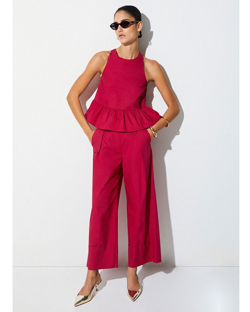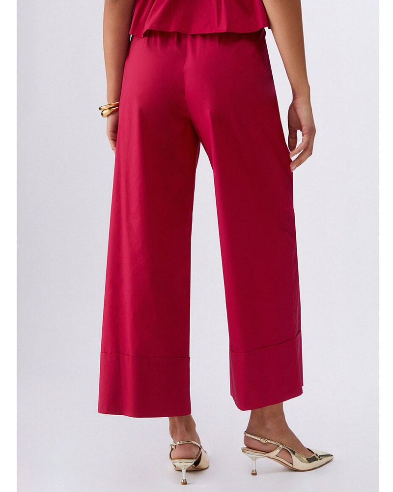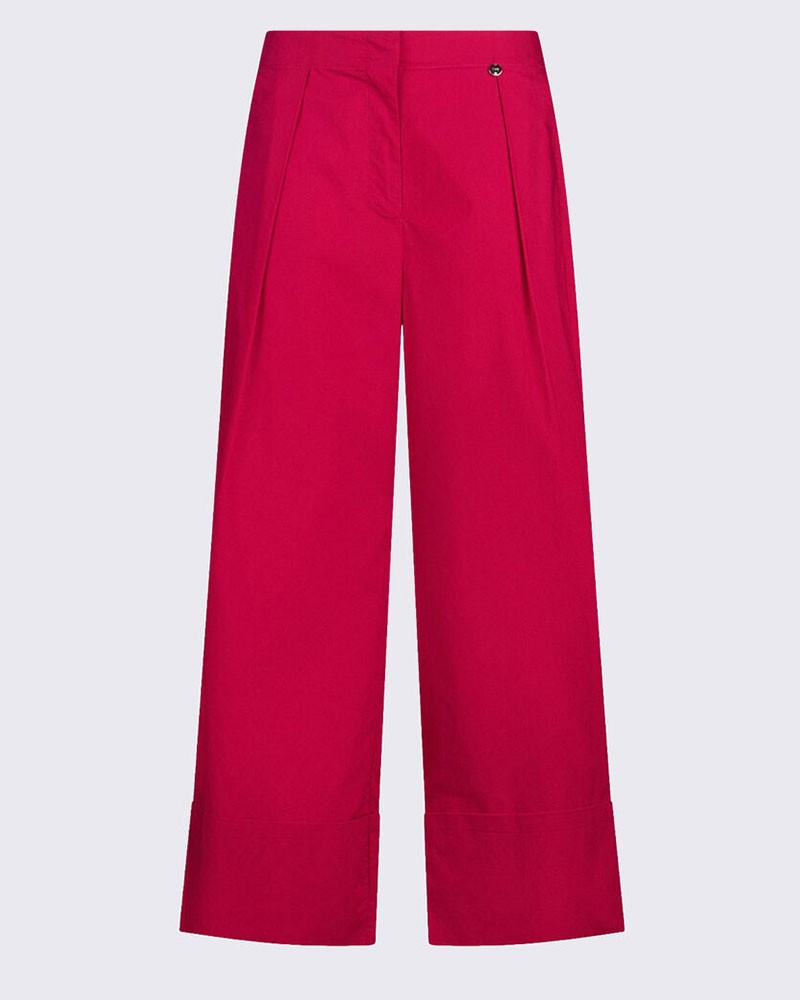 Pantalones de popelina LIU JO de corte holgado y cómodo. Con pinzas en la parte delantera y pernera acampanada por encima del tobillo, realzan la silueta con un toque moderno. El cierre de cremallera y botón completa esta prenda versátil y elegante.