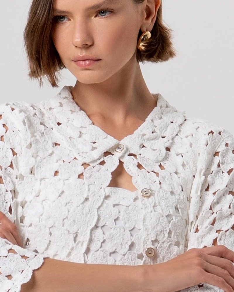 Este cárdigan de encaje de corte regular tiene un encanto delicado y femenino, adornado con un elegante cuello que realza su estilo refinado. El cierre de botones central ofrece practicidad y versatilidad, mientras que las mangas tres cuartos le dan un toque ligero y contemporáneo. Perfecto para completar conjuntos románticos o añadir un toque elegante a looks cotidianos.
