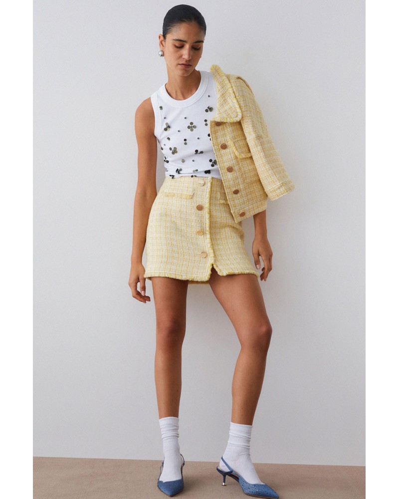 Líneas depuradas y un estilo contemporáneo caracterizan esta blusa de algodón elástico, diseñada para realzar la figura con comodidad. El tejido acanalado aporta textura y definición, mientras que los apliques en la parte delantera le dan un toque distintivo y moderno.