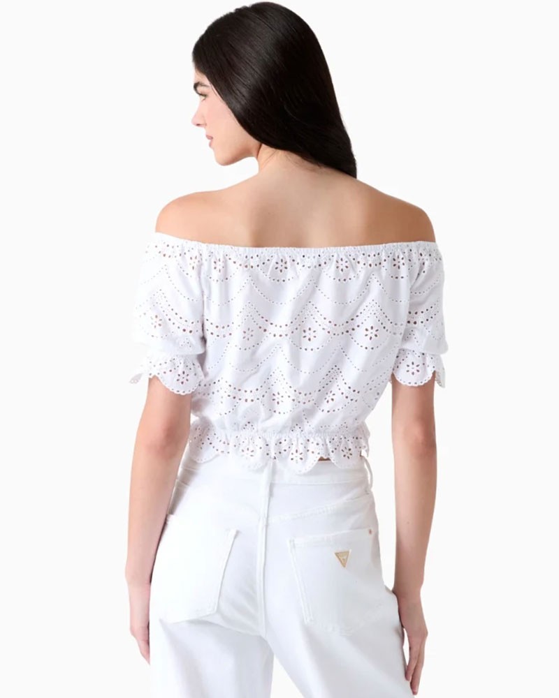Un top corto femenino y contemporáneo confeccionado en una suave mezcla de algodón. Su diseño con escote Bardot y escote barco realza el busto, mientras que las mangas cortas le aportan un toque casual y versátil. El detalle de ojales le da un toque distintivo y moderno, ideal para looks veraniegos a la última.