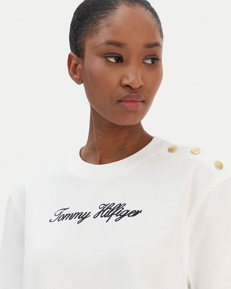 La colección Tommy Hilfiger presenta una camiseta de corte holgado que permite total libertad de movimiento, confeccionada en algodón elástico. Cuenta con cuello redondo clásico y botones decorativos en el hombro. Logotipo bordado.