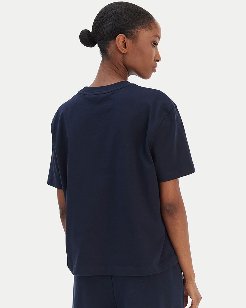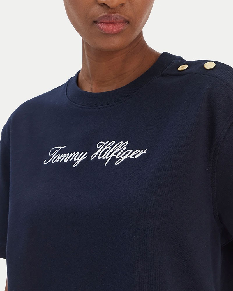 La colección Tommy Hilfiger presenta una camiseta de corte holgado que permite total libertad de movimiento, confeccionada en algodón elástico. Cuenta con cuello redondo clásico y botones decorativos en el hombro. Logotipo bordado.