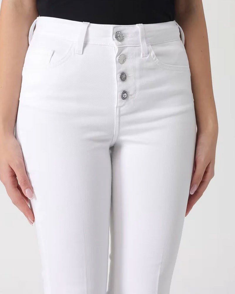 Ce jean est confectionné en denim stretch délavé et usé. Il possède cinq poches, une taille haute fermée par un bouton bijou, une coupe slim et un ourlet légèrement évasé.