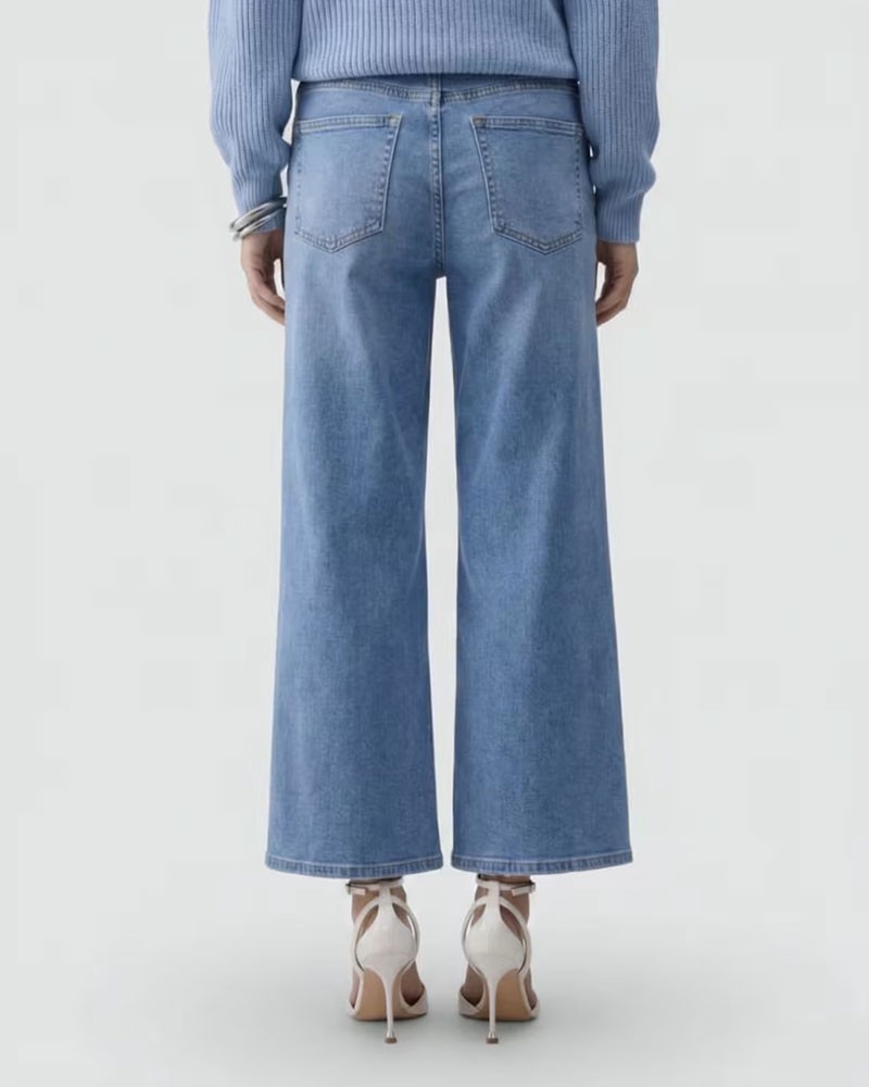 Jean évasé court, fermeture éclair invisible et bouton logo apparent sur le devant, ceinture à passants, cinq poches, surpiqûres contrastantes, logo métallique appliqué au dos, effet délavé et légèrement extensible.