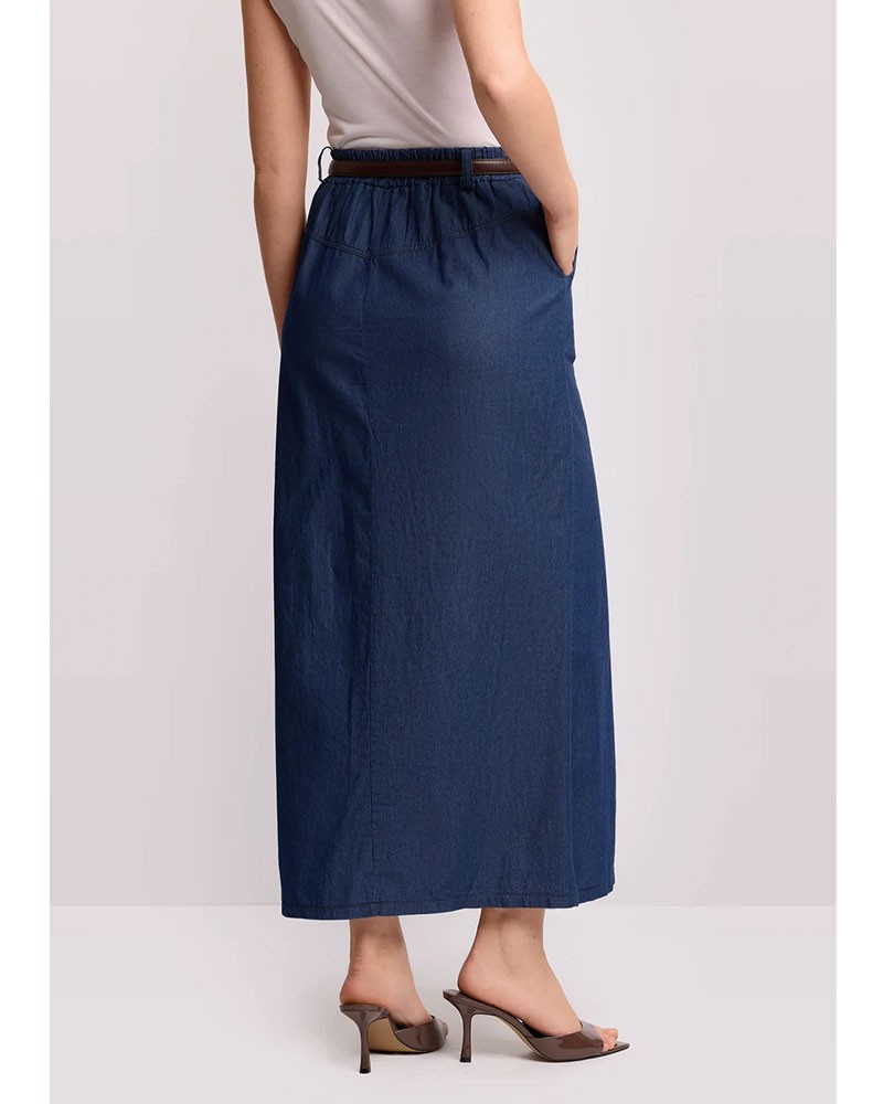 Jupe longue KOCCA Handrej, en denim de coton, issue de la collection capsule Pure Verve. Sa coupe droite et sa silhouette flatteuse lui confèrent une allure moderne et épurée. La taille haute est soulignée par de fins passants de ceinture et une ceinture à boucle dorée contrastante, un détail qui apporte une touche d'élégance. La fente centrale sur le devant insuffle mouvement et féminité, tandis que les poches latérales raffinées et les finitions ton sur ton apportent la touche finale à cette pièce soignée et sophistiquée.