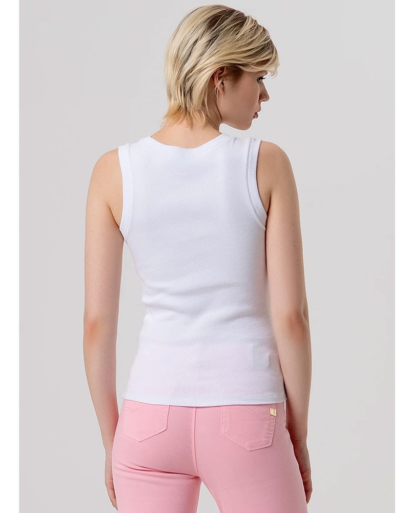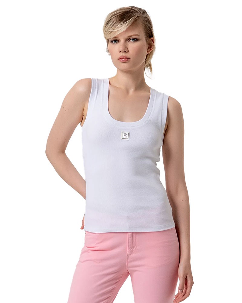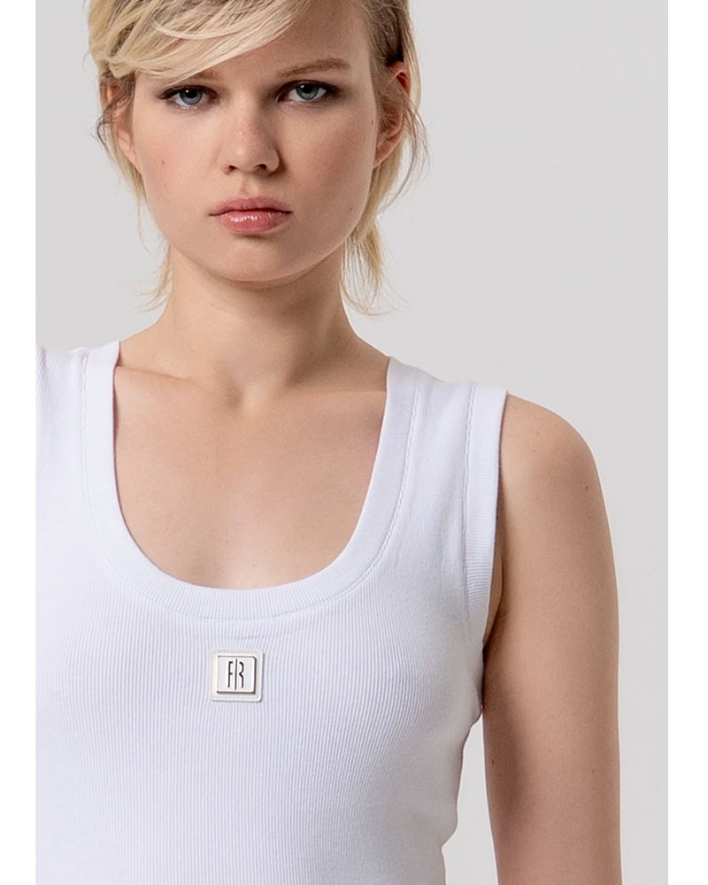 Débardeur Fracomina au design simple et féminin, confectionné en tissu côtelé qui flatte la silhouette. Ce modèle présente une encolure arrondie et large ainsi que de larges bretelles pour un confort optimal et une coupe ajustée. Le logo sur le devant apporte une touche distinctive et moderne. Parfait à porter seul ou comme base pour des looks superposés, c'est une pièce polyvalente idéale pour des tenues décontractées et contemporaines.