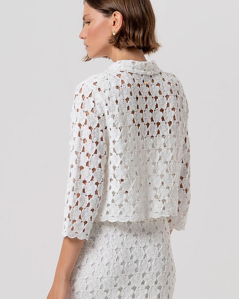 Ce cardigan en dentelle à la coupe classique dégage une allure délicate et féminine, rehaussée d'un col élégant qui souligne son style raffiné. Sa fermeture boutonnée centrale offre praticité et polyvalence, tandis que ses manches 3/4 apportent une touche de légèreté et de modernité. Idéal pour compléter une tenue romantique ou ajouter une note d'élégance à vos looks du quotidien.