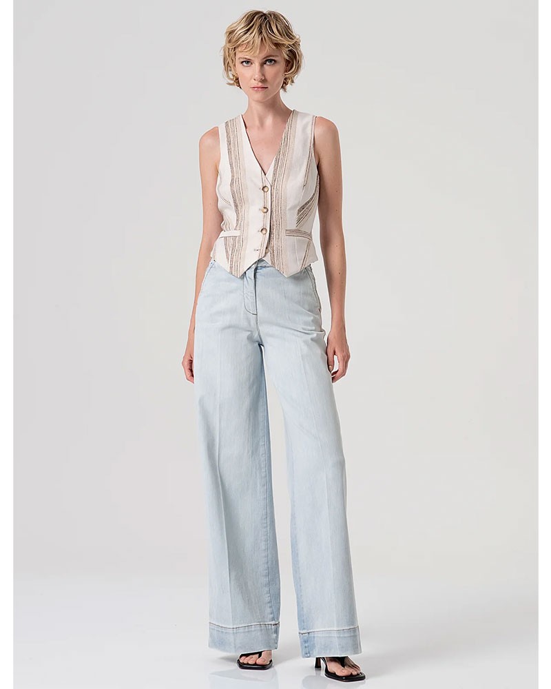 Le gilet ajusté de Fracomina est confectionné dans un élégant tissu rayé qui lui confère une allure sophistiquée et contemporaine. Sa coupe cintrée met en valeur la silhouette, tandis que son décolleté en V apporte une touche de féminité et affine la silhouette. La fermeture boutonnée centrale est à la fois pratique et raffinée, et les finitions passepoilées apportent une touche d'élégance. Parfait à porter seul ou associé à d'autres pièces pour des looks chics et tendance.