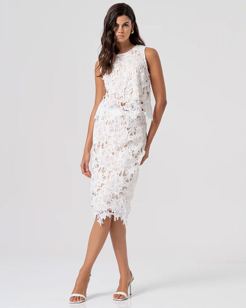 Débardeur en dentelle délicate, orné d'un élégant col rond qui met en valeur le décolleté. Son design raffiné est sublimé par une découpe en forme de goutte dans le dos, pour une touche de sensualité discrète. Parfait pour un look décontracté chic ou plus sophistiqué.