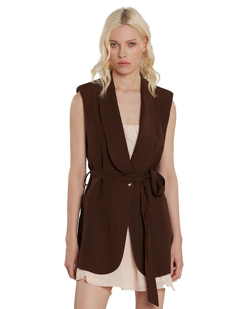 Bertiusa est un blazer long sans manches à un bouton, ceinture assortie et poches. Son design élégant et moderne affine la silhouette. La ceinture souligne délicatement la taille, tandis que la coupe longue apporte une allure raffinée et contemporaine, idéale pour un jeu de superpositions chic.