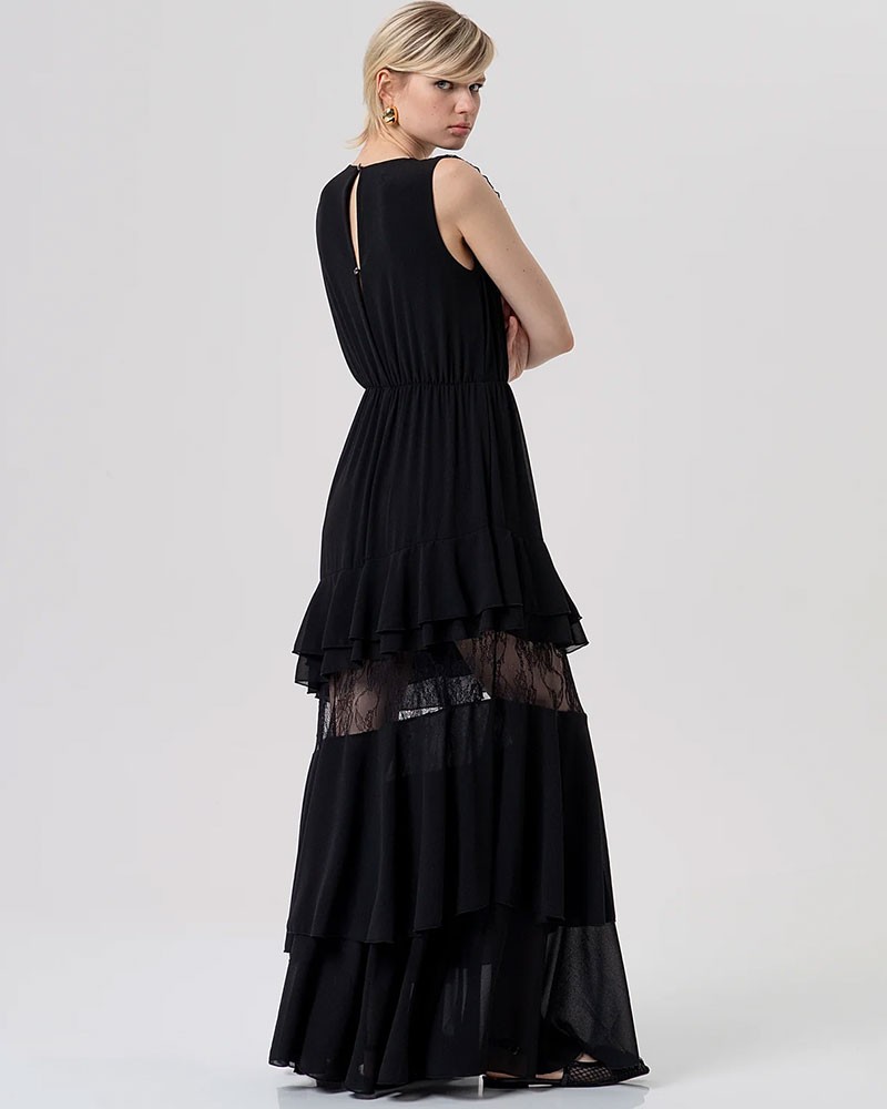 Cette robe longue sans manches de Fracomina présente une coupe élégante et féminine. Son décolleté cache-cœur est orné de délicats volants qui lui confèrent mouvement et sophistication. Des empiècements de dentelle apportent une touche romantique et créent un agréable contraste de textures. La jupe ample, décorée de volants et de froufrous, complète la robe avec une silhouette fluide et spectaculaire, idéale pour les grandes occasions et les looks sophistiqués.