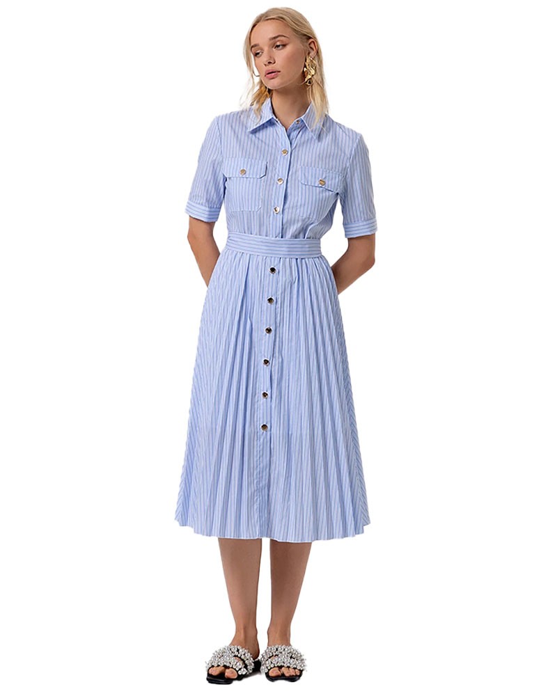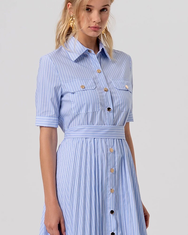 Cette robe-chemise midi à la coupe classique est confectionnée en popeline rayée pour un style frais et raffiné. Elle présente un col classique et une fermeture boutonnée sur le devant, agrémentée de poches poitrine pratiques. La ceinture souligne la silhouette, tandis que la jupe plissée apporte mouvement et légèreté. Ses manches 3/4 complètent le modèle, idéal pour un style élégant et polyvalent.
