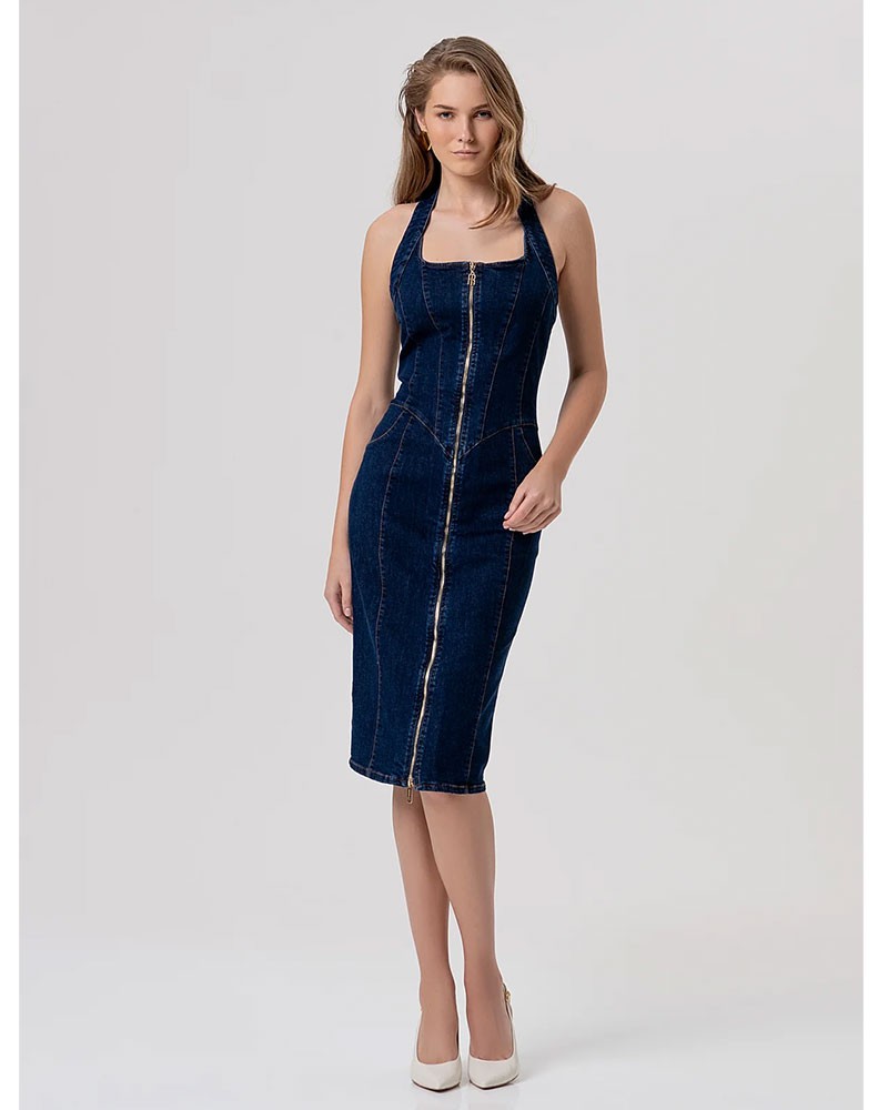 La robe midi ajustée de Fracomina est confectionnée en denim brut pour un look moderne et audacieux. Sa coupe cintrée flatte la silhouette, tandis que l'encolure carrée apporte une touche contemporaine et féminine. La fermeture éclair métallique centrale ajoute du caractère et de la praticité, devenant un détail distinctif. Le dos nu complète la robe avec une touche audacieuse et sensuelle, idéale pour des tenues polyvalentes du matin au soir.