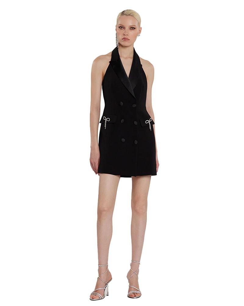 Robe courte à col halter et coupe veste ornée de boutons et de nœuds en strass, pour un style contemporain et féminin. Sa ligne structurée et ses détails scintillants la rendent idéale pour un cocktail ou une soirée élégante, alliant modernité, glamour et charme couture.