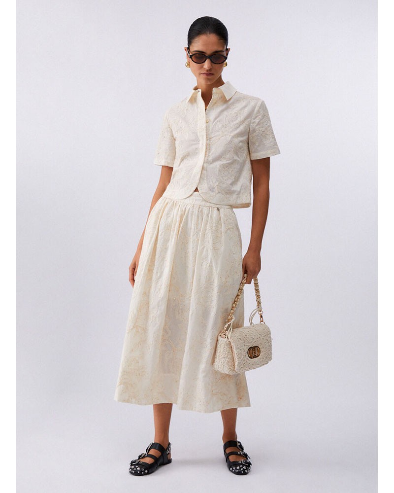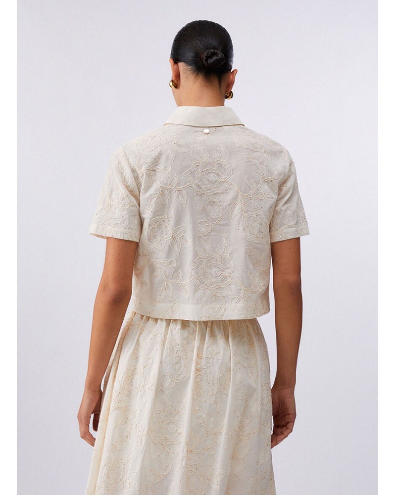 Camicia LIU JO in mussola di cotone, leggera e raffinata. Impreziosita da ricami floreali e micro paillettes, presenta colletto classico e chiusura con bottoni nascosti per un’eleganza delicata e femminile.