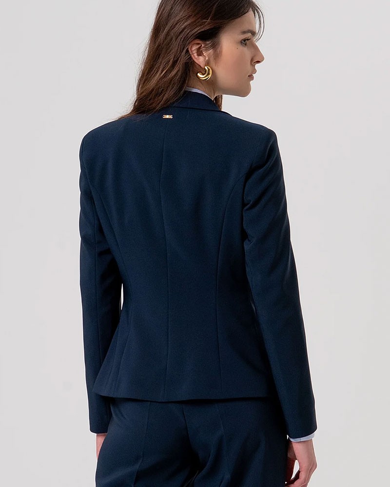 Blazer slim monopetto dal taglio elegante e contemporaneo, caratterizzato da revers classico che dona un tocco raffinato al capo. La chiusura con bottone centrale valorizza la silhouette, mentre le tasche a filetto aggiungono praticità senza rinunciare allo stile. Completato da maniche lunghe, è perfetto per outfit formali o per dare un tocco sofisticato ai look quotidiani.